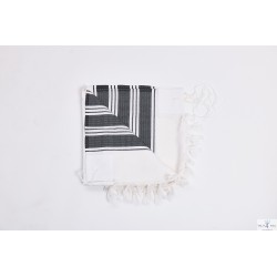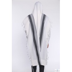 Tallit produit de "Talitania". Talit en Laine Modèle "Carmel". Tissé à la main avec des rayures noires dans un fil d'argent combiné. Bordure assortie.