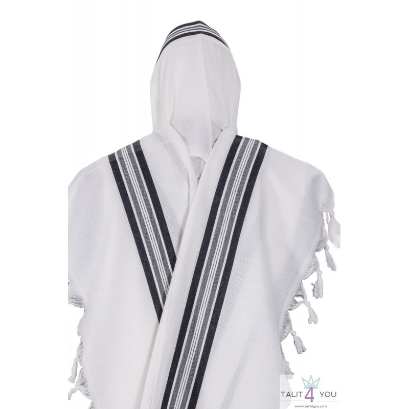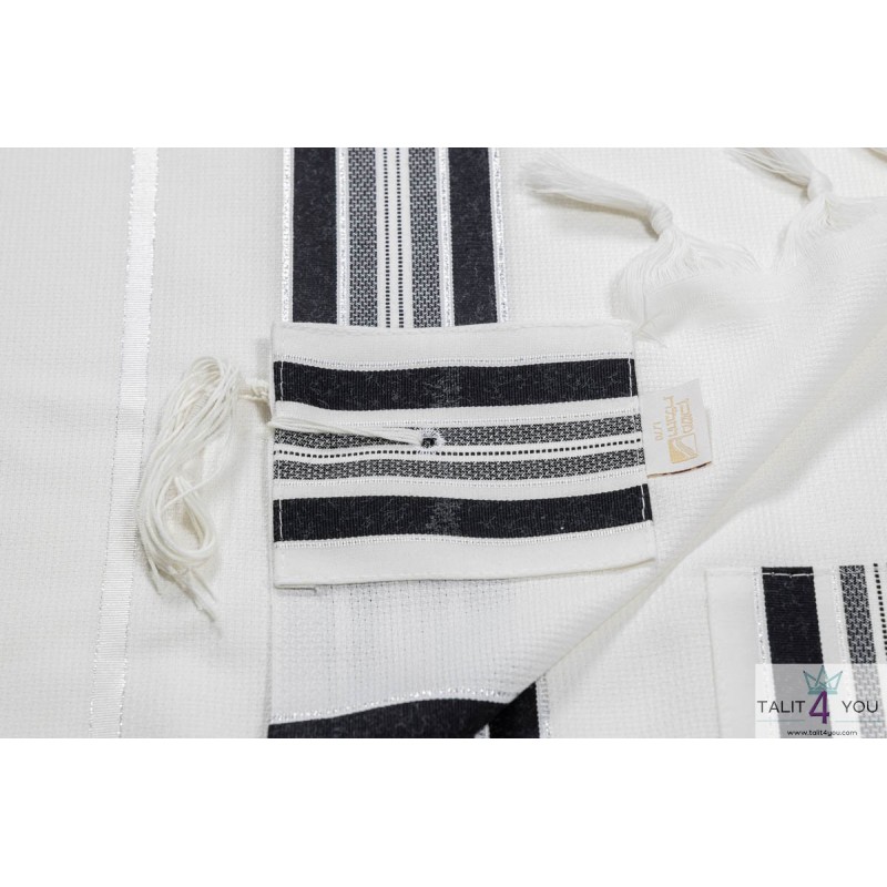 Ce Talit fabriqué en Israel dans une usine situé a béer Shéva vous propose l'un des plus beau Talit sur le marché. La marque de ce Talit est Mishkan Hatchelet Ce Talit est de qualité supérieure. Le tissage(L'entrelacement) exclusif de la laine aide le Talit à ne pas glisser.De même il accorde le sentiment très léger. Le Talit est 100 % laine de brebis.