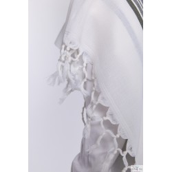 Un châle de prière unique et luxueux, avec des doubles franges, un châle de prière tissé aux points de laine pour éviter de glisser et de stabiliser les épaules. Bordure et coins uniques assortis au châle de prière.